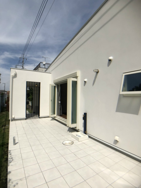 タイルテラスと美しいグリーンの芝を眺める。