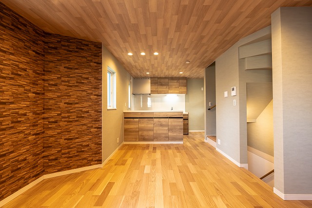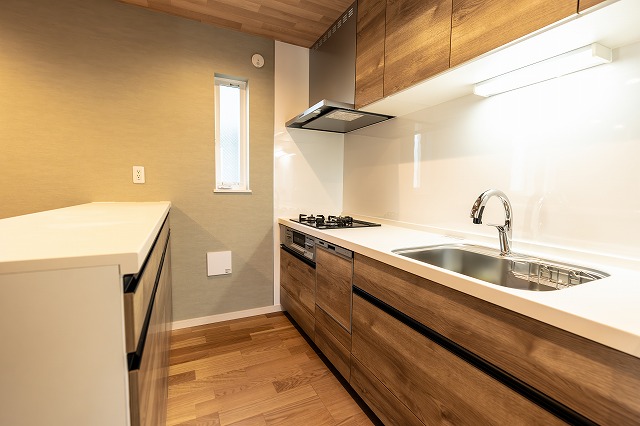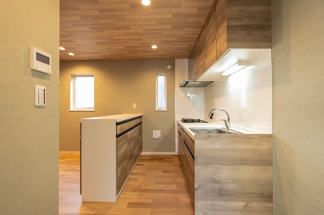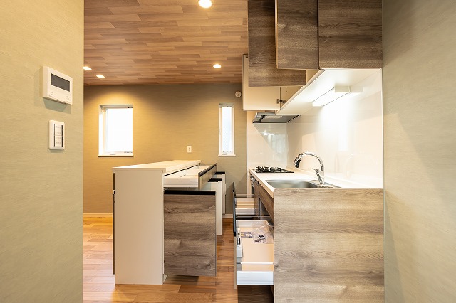 キッチンカウンターは収納棚付のため、食材等も全部収納可能。リビング側からも開閉でき、ものがあふれがちなリビングもスッキリ♪