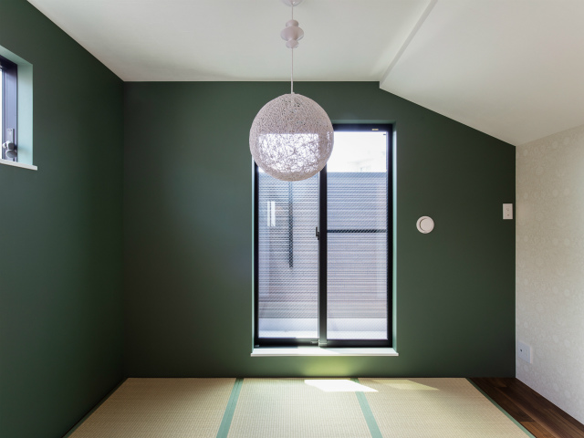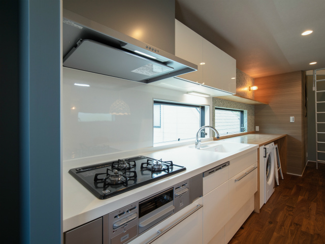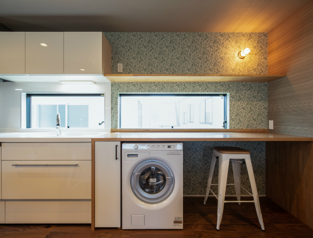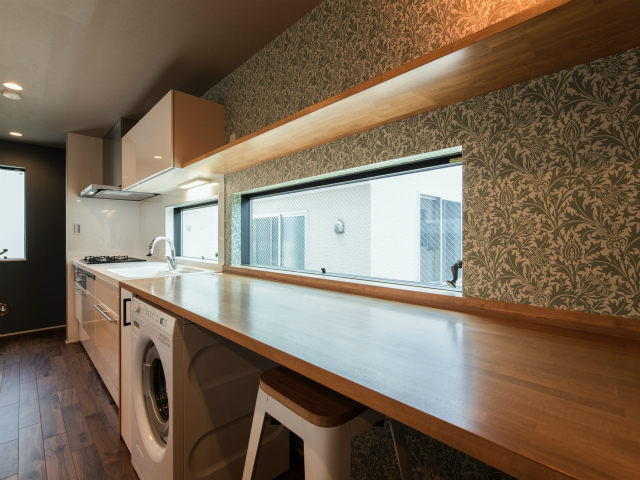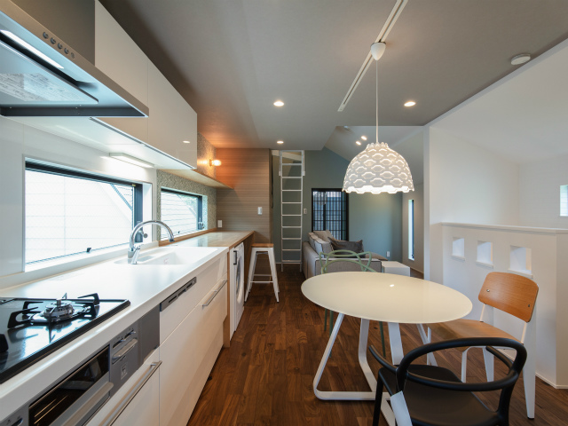キッチンにはカウンターテーブルを造作。家族が見守る中、子供達が勉強したり、絵を描いたり・・・。リビングからの続き和室で遊んでも。