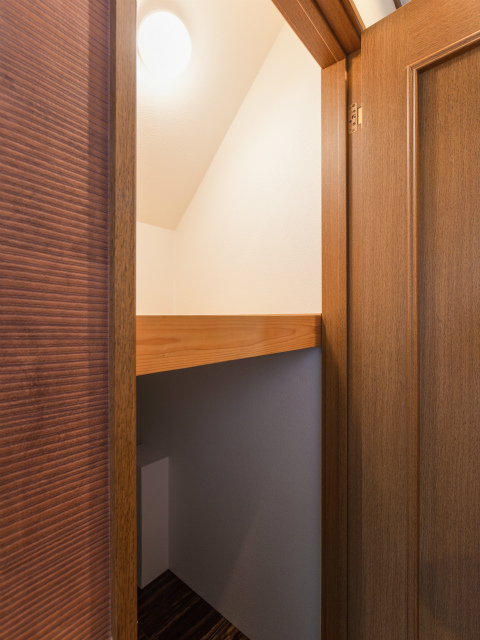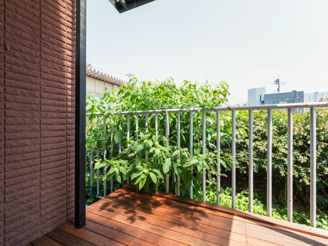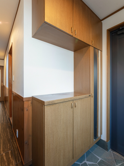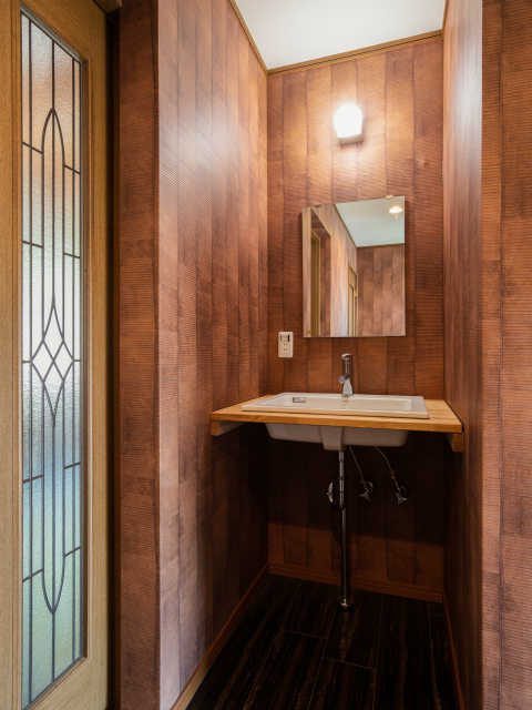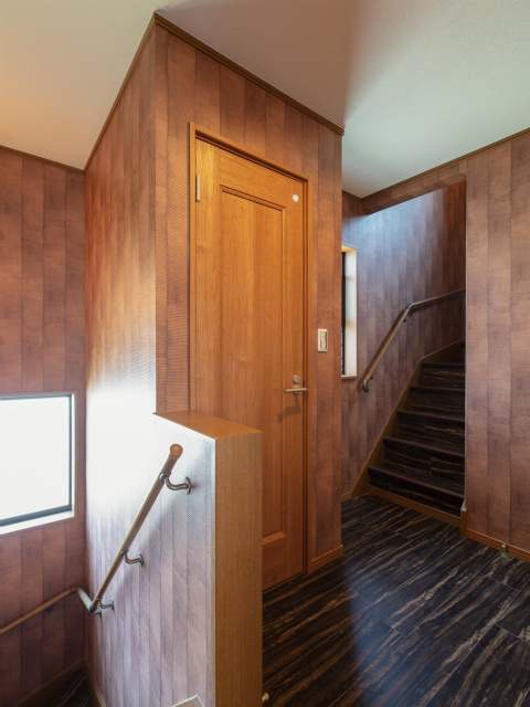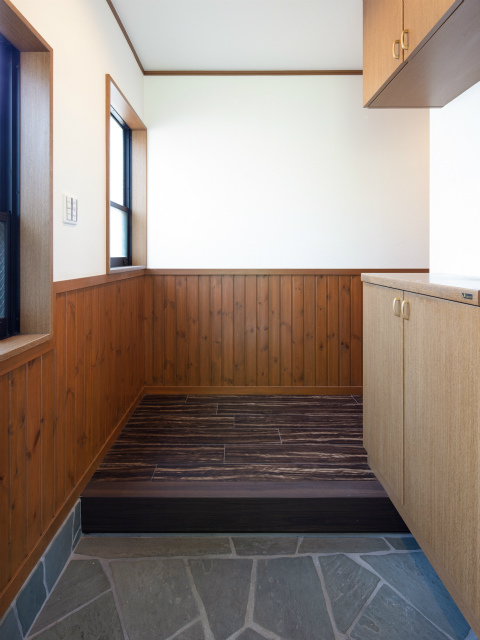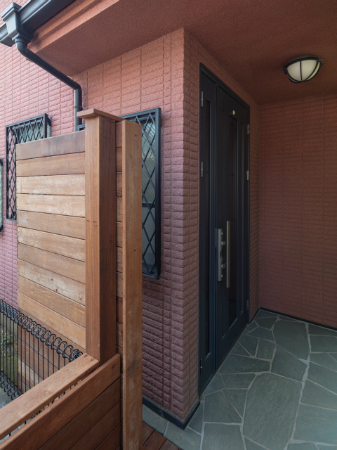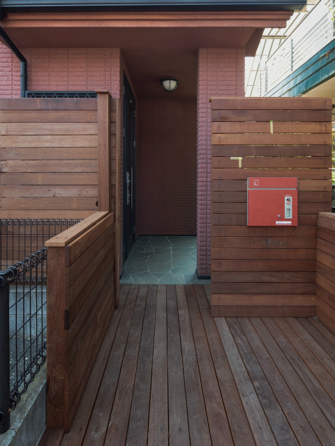 敷地に入り玄関まで辿りつくスペースには、ラスティックな木材を利用し、素材の持つ質感の表情が生かされたシンプルかつ魅力的なスペース。
