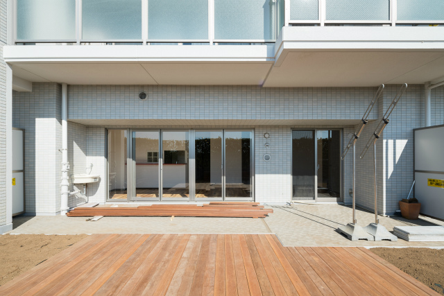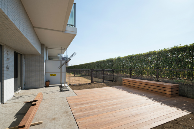 広い専用庭にウッドデッキ新規設置しました♪ ペットと遊ぶ空間としても♪